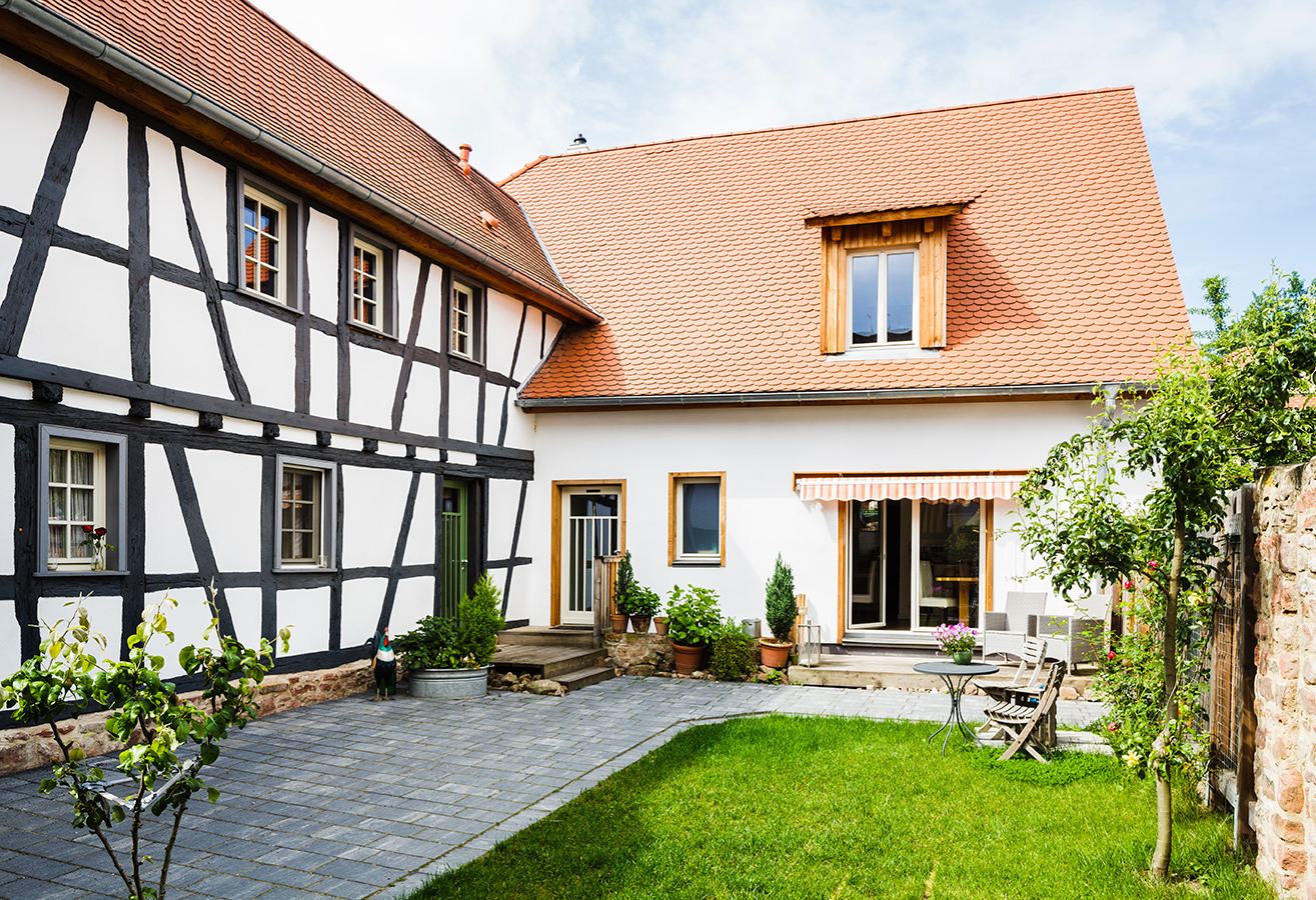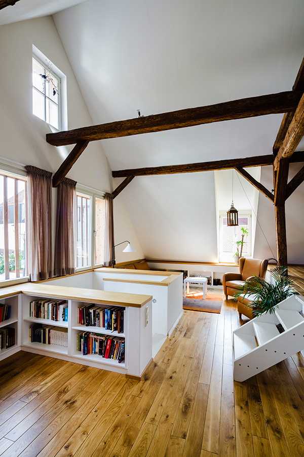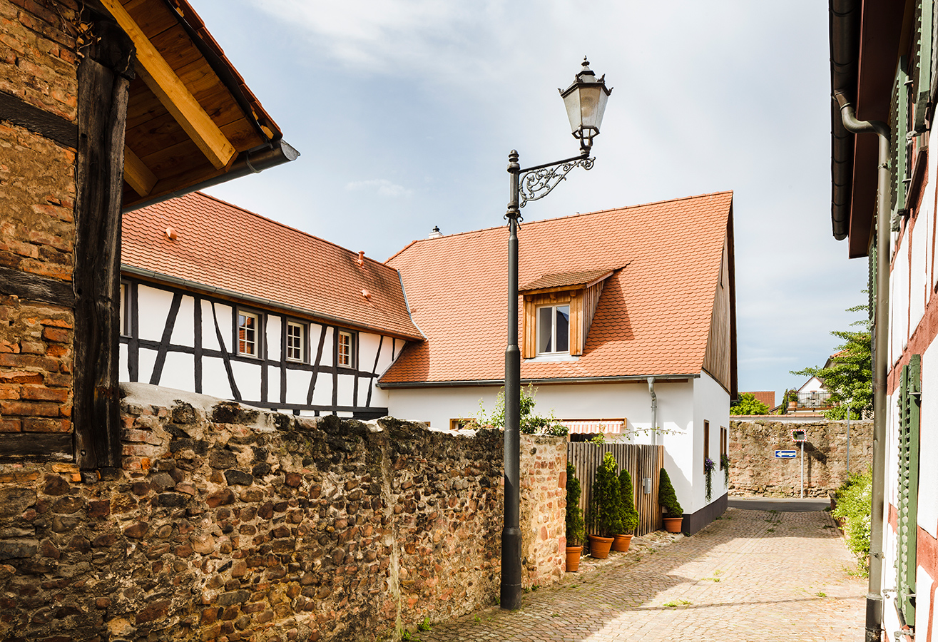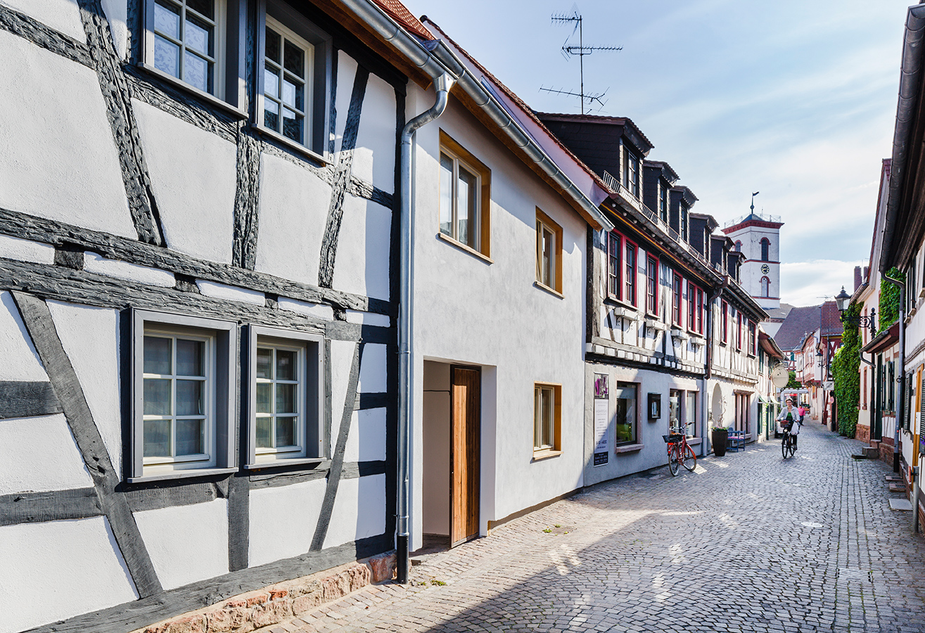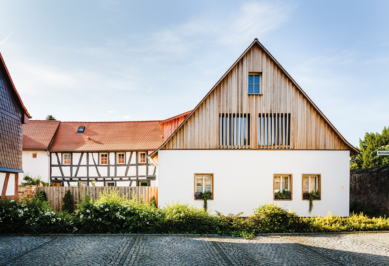 Bei der Wolfstraße 15 handelt es sich eigentlich um einen klassischen Vier-Seiten-Hof mit landwirtschaftlicher Nutzung. Leider ging im vergangenen Jahrhundert die vierte Seite des Hofes verloren. Der ehemalige Stall hinterließ jedoch ein Loch in der Natursteinmauer, was heute die Adresse des Ensembles ist. Es war einmal die abgewandteste Seite des Hofes. Deutlich untergliedert in Wohnhaus, Scheune und Nebengebäude kann man die Struktur des Vier-Seiten-Hofes wieder ablesen. Das Fachwerkhaus als ursprüngliches Wohnhaus der Landwirtsfamilie, die große Scheune für die Lagerhaltung mit der riesigen geschlossenen Dachfläche, die Einfahrt mit ihrem in den Jahren nach dem Krieg aufgepfropfte Wohnnutzung und dem zu einem Törchen degradierten Tor sowie der Schuppen mit recht wahrscheinlicher Tierhaltung im Erdgeschoss. Die Kanten der Bauten wurde wieder scharf gestellt und dem Ensemble durch die Verwendung von unbehandeltem Lärchenholz ein bindendes Glied gegeben. Die klassische Schalung des Scheunengiebels ist zwar derzeit sehr dominant, doch wird die Wetterseite des Baus mit den Jahren immer blasser und grauer werden, bis die Fensterausschnitte am Tag fast nicht mehr in Erscheinung treten. So spielt die Zeit wieder einen entscheidenden Faktor für die Einstellung der Harmonie des Ganzen. |
