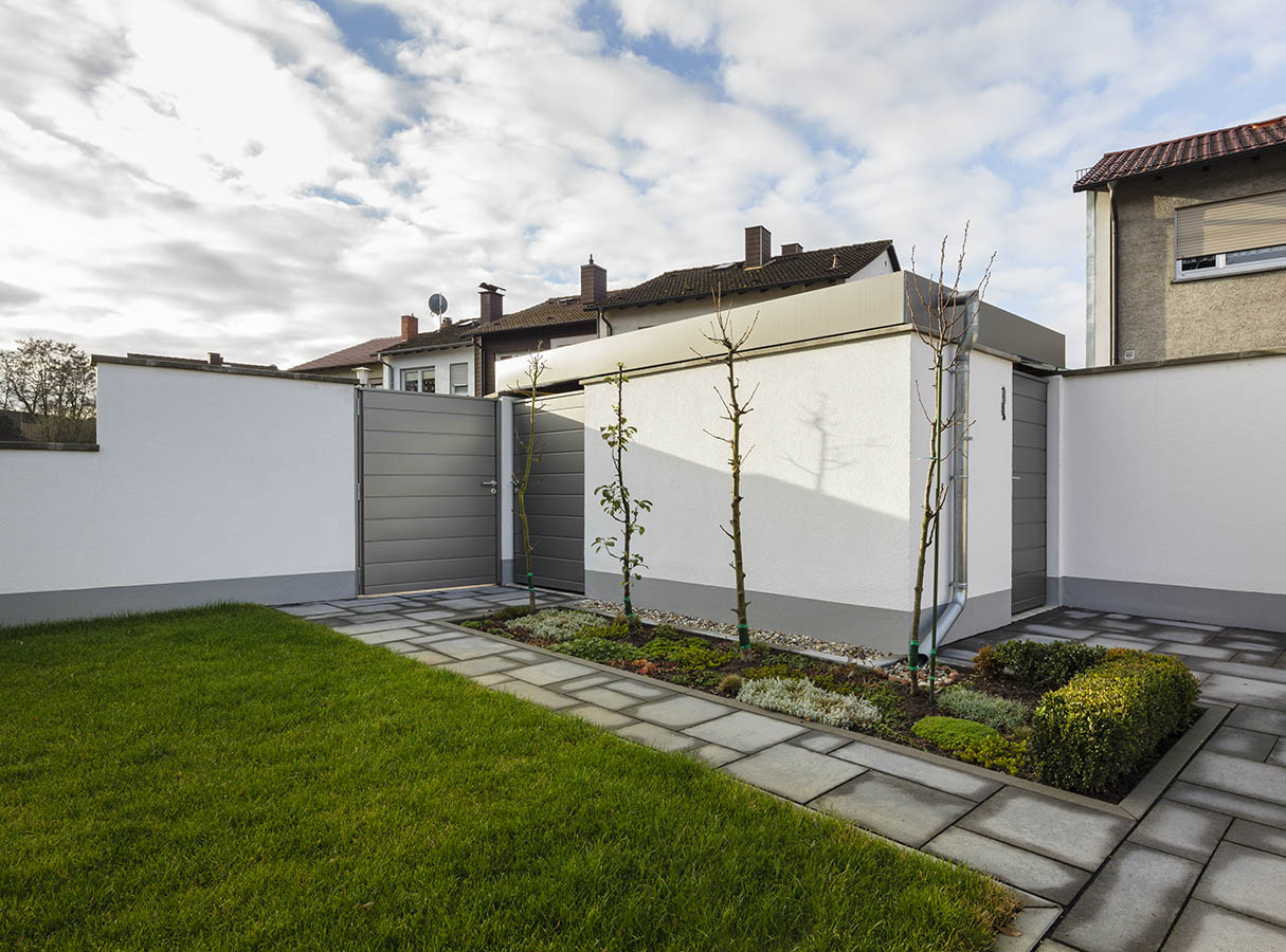 Eigentlich waren wir sehr verunsichert, ob das Bauherrenpaar tatsächlich einen Architekten für diese Aufgaben benötigt, doch der Ehemann beharrte vehement auf unsere Teilhabe. Ziel war es den Garten altersgerecht zu machen. Dafür musste die arbeitsaufwendige Buchsbaumhecke weichen und die Terrasse als Hochbeet angelegt werden. Dabei hat man schließlich die selbige noch vergrößert und neu angelegt. Abschließend bestand noch der Wunsch nach einem Fahrradschuppen und kleinem Lagerraum.