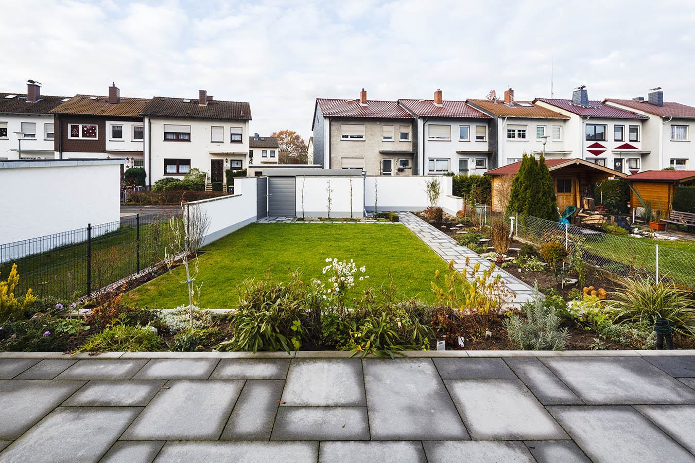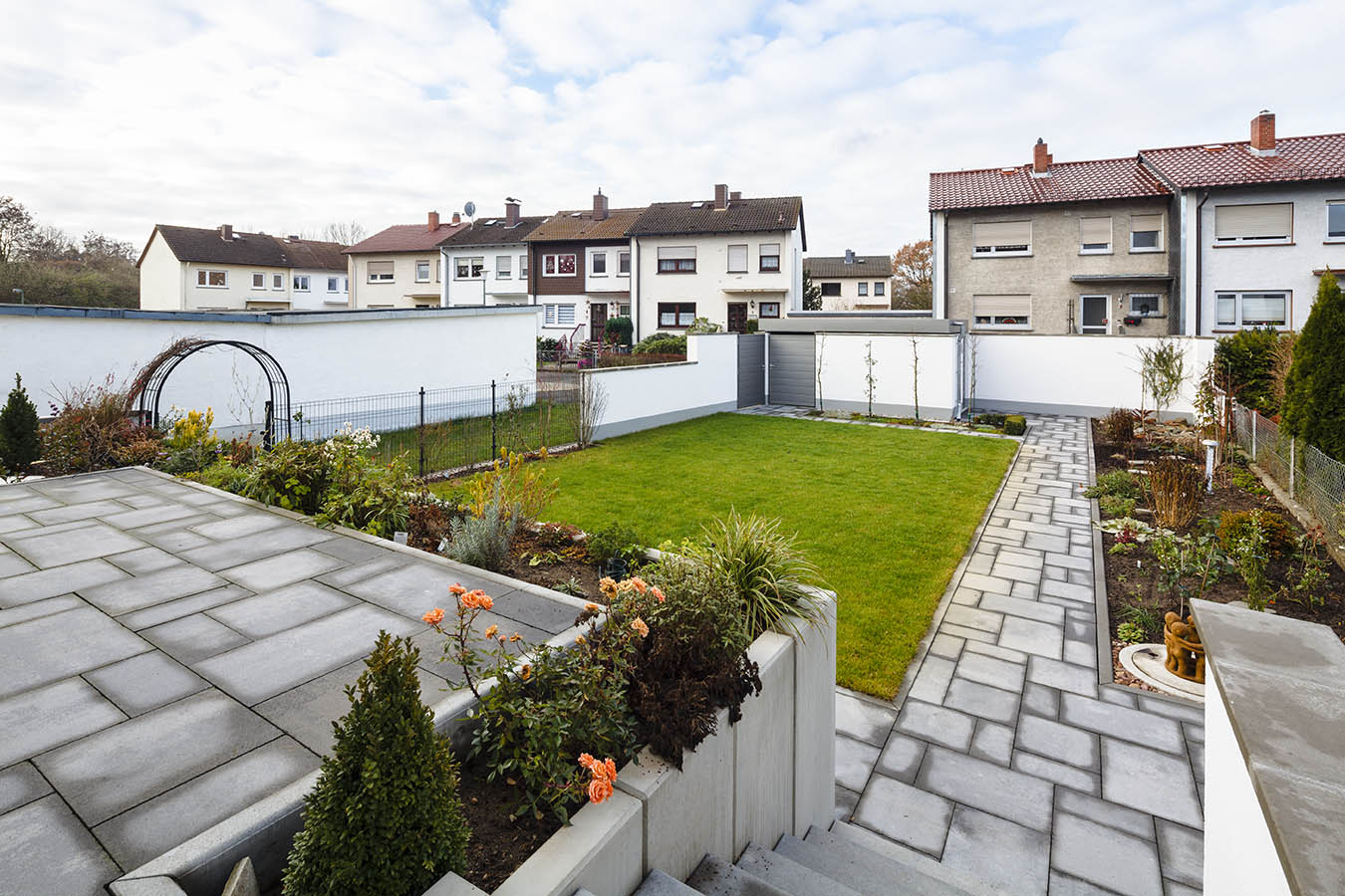 Besonders wichtig war es der Bauherrschaft, dass sich das neue Konzept in den Bestand der 60er Jahre einfügt. Geplant wurde eine Mauer, die sich zum Wohnhaus hin abtreppt; ein in die Mauer integrierter Lagerraum, eine neue erdgeschossgleiche Wohnterrasse inklusive neuer Treppenanlage, Einassung mit L-Steinen und neuen Wegebeziehungen.