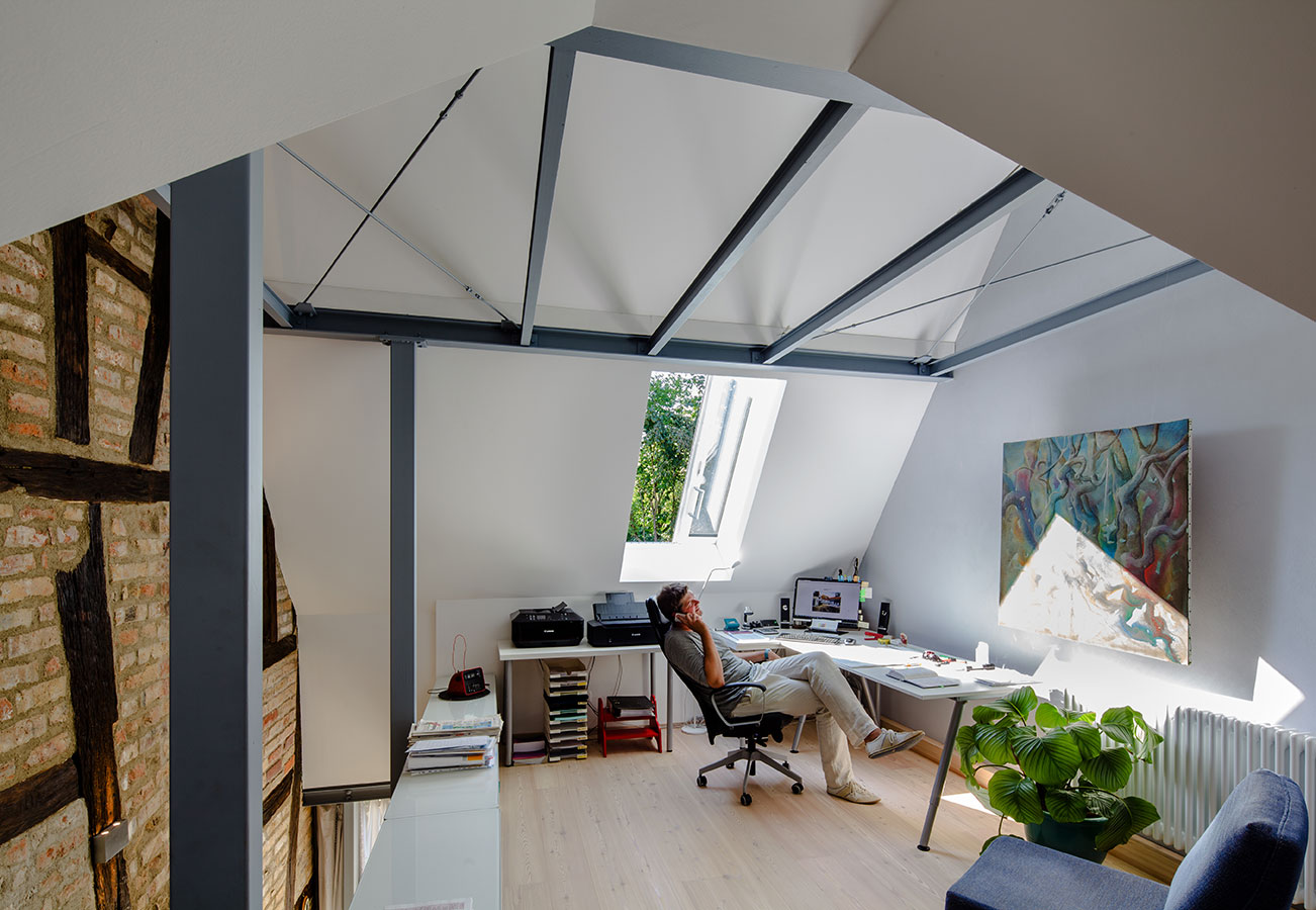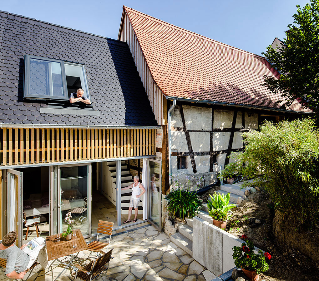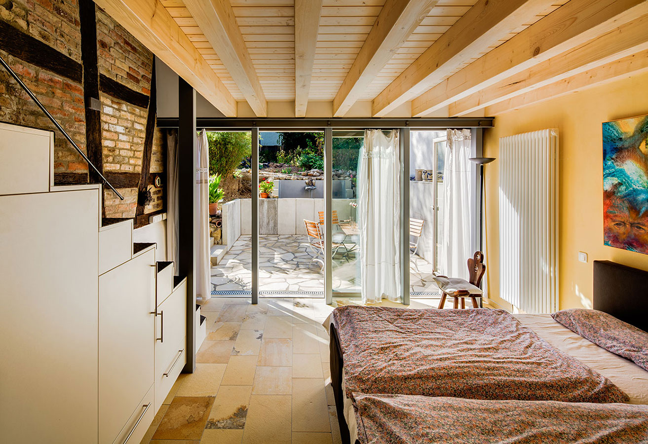 Es gibt selten Projekte auf die man neidisch sein kann. Dieses jedoch ist ein ganz besonders eifersüchtig machendes. Die Bauherrschaft kam nach erfolglosem Start mit einem Kollegen auf unser Büro zu sprechen. Wunsch des Rentnerehepaares war es, die angrenzende Scheune um ein paar Quadratmeter nach oben zu erweitern und vor allem eine altersgerechte Erschließung in die Schlafräume im Obergeschoss bzw. Dachgeschoss zu generieren. Bis hier hin hatte das Haus schon zwei Treppen, beide jenseits jeder Norm, und vor allem für das Alter ziemlich ungeeignet. Gefüttert wurde das Vorhaben noch von dem Gedanken, das Objekt noch einmal für die Zukunft zu ordnen, denn zahlreiche "Bastelmaßnahmen" aus den Nachkriegsjahrzehnt haben das Ensemble deutlich verzerrt. Unser Büro nahm sich dem Anfordernungskatalog an und veränderte das Konzept grundlegend. Aus der Erweiterungsmaßnahme nach oben wurde eine ebenerdige Maßnahme in die Länge. Das "Gebastel" mit dem engen Treppenhaus wurde vollständig abgerissen und schuf Platz für das neue, dem Garten zugewandte Schlafzimmer. Dem Anspruch nach mehr Fläche wurde im neu darüber positionierten Dach entsprochen. Hier zeigt sich heute ein moderner, offen großzügiger Hobby- und Arbeitsbereich, der vom Dachgeschoss des historischen Wohnhauses sowie über die neue Treppe als Schrankmöbel ordentlich erschlossen ist. Das Schlafzimmer streckt sich mit maximaler Glasausbeute dem Garten entgegen. Die Fassade ist zu 75 Prozent der Terrasse hin zu öffnen. Der tiefliegende, dadurch gemütliche und warme Platz in Richtung der untergehenden Sonne lässt die Grenzen zwischen Drinnen und Draußen verschwinden. Plätscherdes Wasser vom neuen Teich auf altersgerechter Höhe dringt bei offenen Fenstern ins Schlafzimmer hervor und der großzügige natürliche Garten lässt die Bauherren das vor Jahrzenten liebevoll sanierte Fachwerkwohnhaus fast vergessen. "Wir sind gar nicht mehr vorne! Nur noch zum Kochen! Das Esszimmer wird wohl erst im Winnter wieder zu nutzen sein!" Vielleicht ist es komisch eine Terrasse in Folge eines Schlafzimmerz zu planen. Aber genau in diesem Fall war es vollkommen richtig! Und nun denken Sie einmal darüber nach, wenn Sie an einem Samstagmorgen aufwachen würden und Sie könnten hoch in einen Garten sehen, die Fenster sind auf, Wasser plätschert vor sich hin und man wird dazu eingeladen sich noch einmal umzudrehen und dem Konzert der Natur zu lauschen!? |