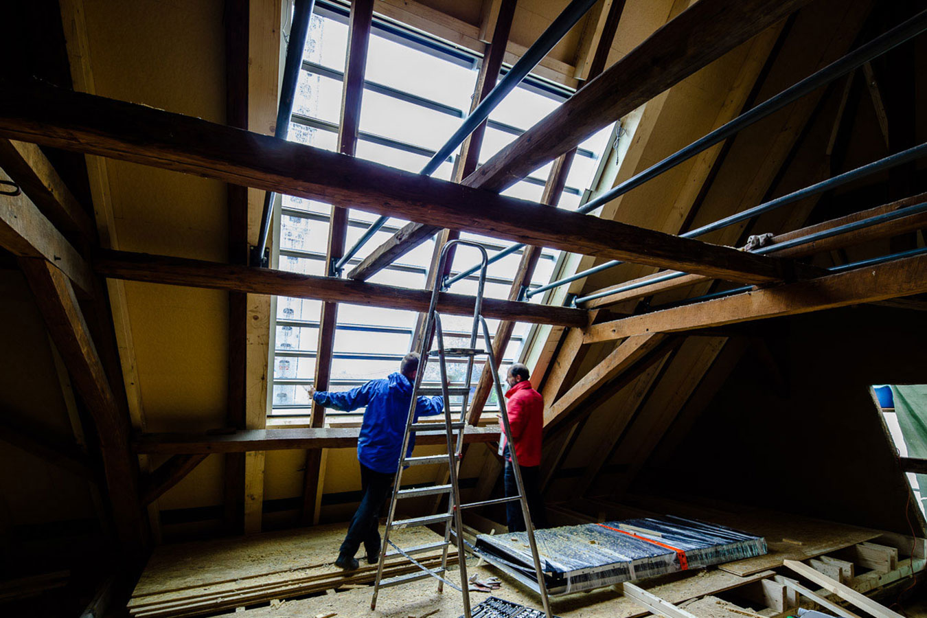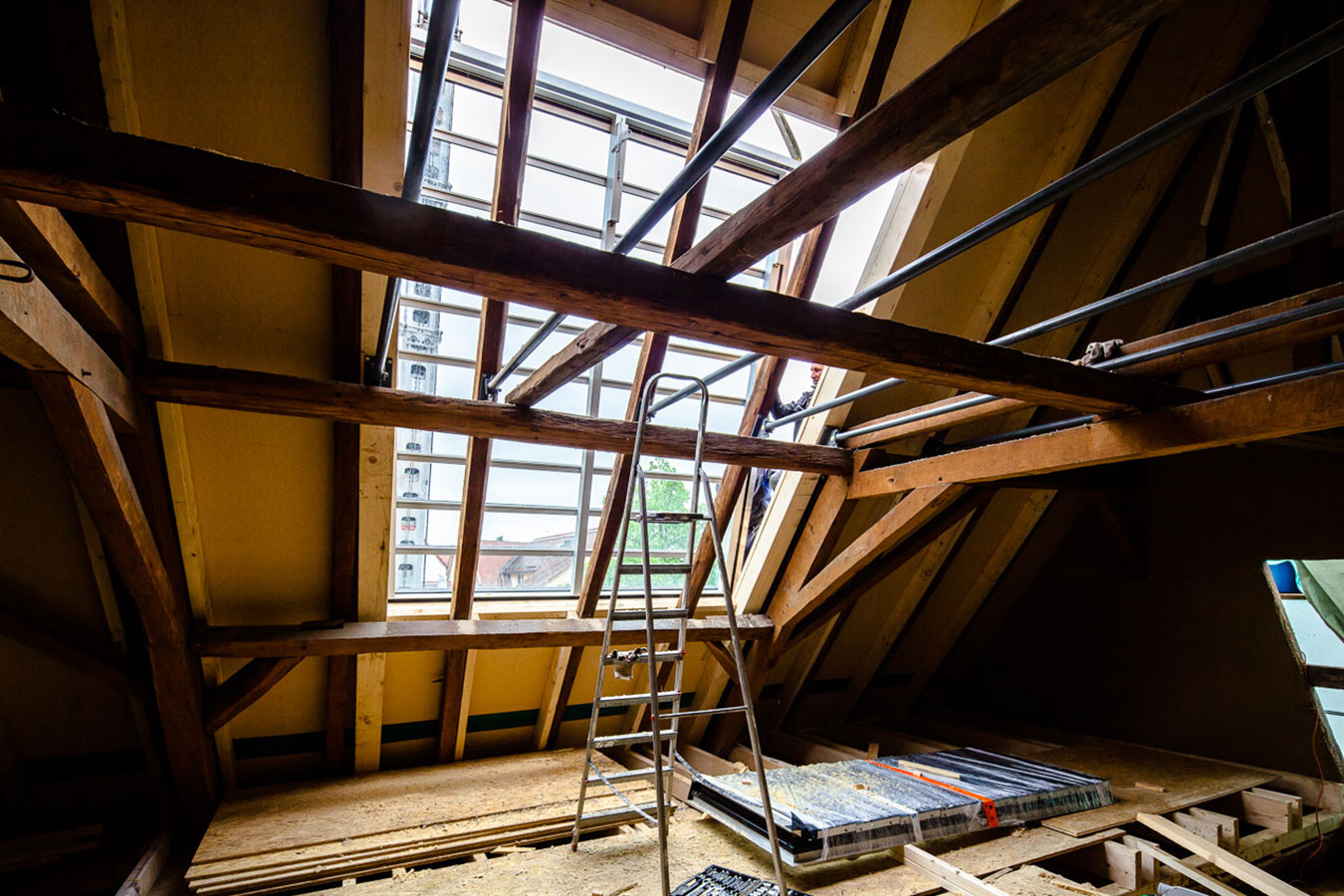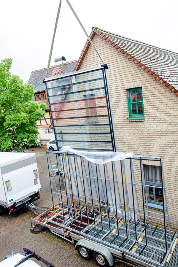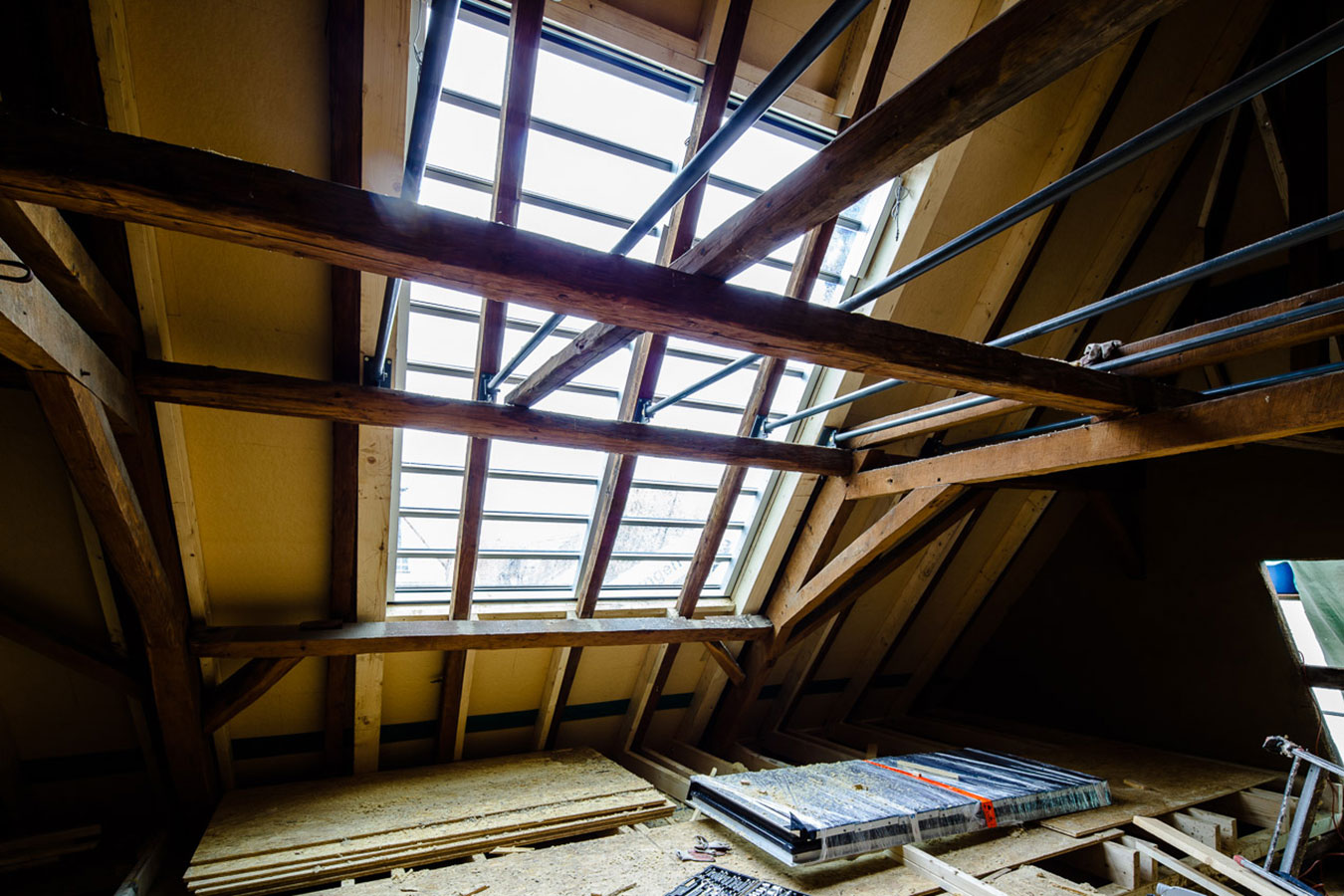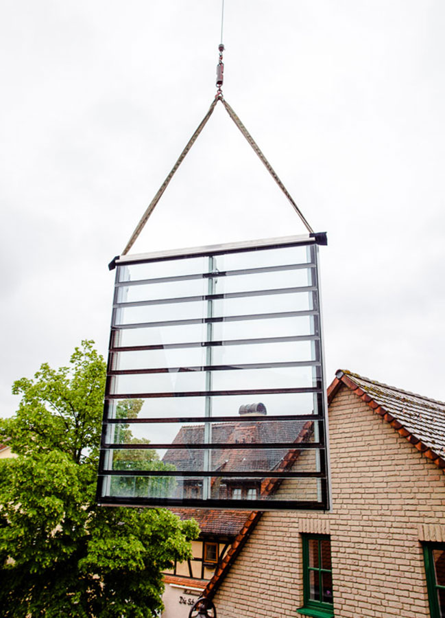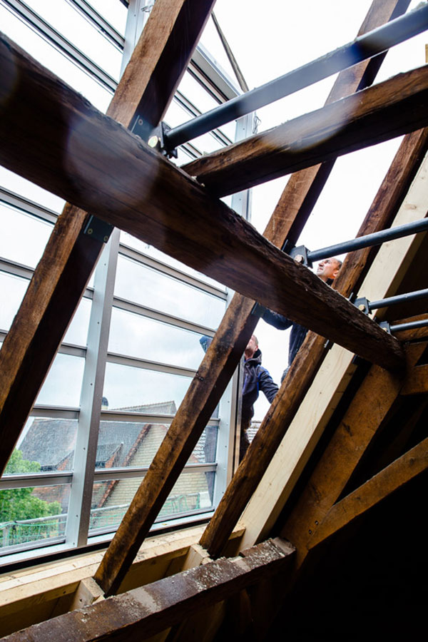 Die Altstadt von Hofheim ist zwar nur noch fragmentartisch erhalten, doch die Bürger der Stadt identifizieren sich stark mit dem Ort und schaffen ein großes Gemeinscahftsgefühl. Genau mitten in dieser Identität wünscht sich die Bauherrin, die vor kurzem den historischen Hof entlang der Hauptstrasse Ecke Sandgasse übernommen hat. Vorerst wurden Sanierungen im Vorderhaus umgesetzt, doch das Schmuckstück soll die frisch unter Kulturdenkmalschutz gestellte Scheune aus dem Jahr 1712 werden. Diese gilt es derzeit zu Wohnzwecken umzunutzen und mit den Notwendigkeiten des täglichen Lebens zu füllen. Da das Grundstück und die umligende Bebauung hohe Ansprüche an das Gebäude stellte mussten individuelle Lösungen gesucht werden ohne den historischen Dachstuhl dabei zu verlieren, den man in der Region vergebens ein zweites Mal suchen wird. So kam das Atelierfenster der Firma Stebler/Schweiz ins Spiel, was sich lediglich auf das vorhandene Dach legt und keinerlei Substanzverlust verspricht. Zudem ist es ein nach der Hofheimer Gestaltungssatzung zulässiges Mittel um Dachräume zu belichten. Wichtiger Faktor für die Zulässigkeit des Fensters: Es hat keine durchgehende Glasfläche sondern das Fenster ist in Lamellen unterbrochen, die im Maß der Ziegeldeckung entsprechen. Es ensteht also keine monotone Fläche, sondern in unserem Fall eine Überlappung von 10 schmalen Lamellen, die sich gemeinsam aufstellen lassen, um auch dem Wunsch nach einem Freiraum zu fröhnen, der in dem Objekt und dem nach Norden gerichteten, dazu sehr engen Hof nicht realisierbar ist. Die Abstimmungen mit dem Denkmalschutz wurden für den Einbau sehr intensiv geführt und es war nicht einfach zu einer Lösung für die Problematik zu gelangen. Das Projekt gilt ausdürcklich als Versuch der Denkmalbehörden zusammen mit unserem Büro für den Umgang mit historischen Scheunendächern, die in erster Linie von einer ruhig liegenden Dachfläche ohne Gaubenaufbauten geprägt sind. Die Maßnahme kann also ausschließlich Vorbild für die Umnutzung ehemaliger Nebengebäude dienen und hat keine Vorbildcharakter für den Umgang mit Wohnhäusern. Auch ist der Einbau dieser speziell für diese Baustelle gefertigten Dachverglasung kein Argument für Dachflächenfenster konventioneller Hersteller wie Roto, Velux, Braas, etc. die nichts auf denkmalgeschütztes Baustellen zu suchen haben. Wir hoffen, dass wir mit dem Objekt in Hofheim eine außergewöhnliche und vor allem gute Lösung geschaffen haben. Dieses zu bewerten obliegt jedoch der Denkmalbehörde, die entscheiden wird, ob dieser Versuch tatsächlich ein gangbarer Weg für die Sanierung historischer Nebengebäude sein kann. Und entsprechende Bauherren wird man ebenfalls suchen müssen, denn die Kosten sind in keinem Fall unerheblich. |