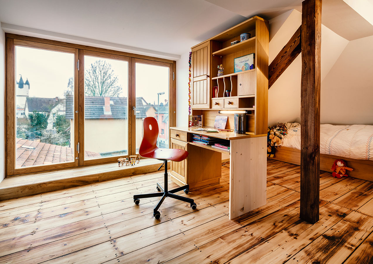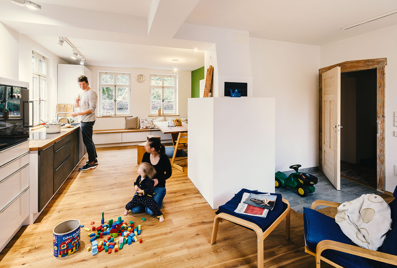 Das kleine Wohnhaus aus den 30er Jahren des vorangegangenen Jahrhunderts soll platz schaffen für eine mittlwerweile sechsköpfige Familie. Im Grunde ist es alles etwas zu eng, doch ein intelligegentes Raumkonzept hat das charmante Wohnhaus vorteilhaft eingeteilt ohne das charmante dabei zu verlieren. Einzig die auf der Hofseite aufgesetzte Gaube stimmt unser Büro nicht in jeder Form zufrieden, zumindest von außen betrachtet. Von Innen im Gegenzug hat das enge Kinderzimmer unter dem Dach den wohl spannensten Blick in Richtung der Steinheimer Altstadt. Begonnen hat alles mit viel Rückbau: Die Blumenfenster der 60er Jahre wurden zurückgebaut, der Anbau mit Walmdach und den ehemaligen Bädern musste dem Vorgarten weichen um auch auf der schmalen Stirnseite wieder Licht in das Gebäude zu bringen, ehemalige Fensteröffnungen tun gleiches und stellen den klassischen Bau wieder in seine Proportionen. Neben dem Blick über Steinheim ist wohl das neue Zentrum der Familie im Erdgeschoss das besondere Highligt des Hauses. Für die großzügige Wohnküche mit angeschlossenem Wonbereich samt großzügiger Spielfläche für die jungen Kinder wurden drei Wände entfernt und die Wand in Richtung Garten durchlöchert. Der Grundofen im Zentrum Gliedert den Großraum in seine einzelnen Bereiche intelligent auf. Nachdem nun das Haus umgestaltet und bezogen ist, wird man sich nun wohl an die Gartengestaltung wagen. Wir freuen uns auf das Ergebnis. |